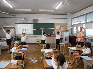 2年生は、養護教諭による保健指導がありました。おなかの中の様子が分かる、長いひも状の模型をみんなで持って、楽しく学習しました。