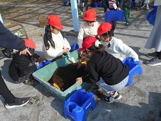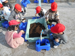 1年生は、チューリップの球根を植えました。赤・白・黄・ピンクの色から、自分の好きな色を2つずつ選んで、自分の植木鉢に植えました。花が咲く頃には2年生ですね。