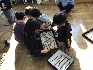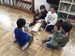 先週まで1年生が作っていた秋の実や葉っぱなどを使ったおもちゃで、今日は、1年生が2年生を招待して一緒に遊んでいました。大きな松ぼっくりをボール代わりに使ったり、枝を使って迷路をつくったりしてありました。以前は2年生が1年生を招待しておもちゃ祭りを開催していましたが、今日はお返しにという感じです。交流を深めるひとときでした。