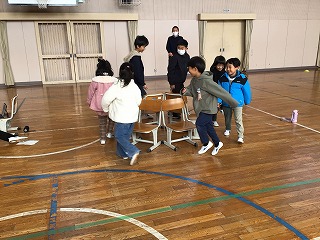 6年生は国語の授業で「みんなで楽しく過ごすためには」をもとに、1年生との交流の企画を立てました。体育館で5つのブースに分け、椅子取りゲームやハンカチ落としなどを行いました。1年生にルールをわかりやすく説明した後、一緒に交流しました。1年生も6年生も素敵な笑顔があふれていました。