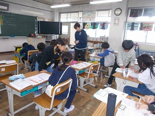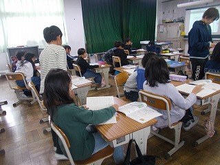 「登り棒が3メールで、木は登り棒の2倍、校舎は木の4倍である時、校舎の高さは何メールか」という問題を解いていました。順番に考えて、木は6メートルでその4倍だから24メートルという考えと、まとめて考えると2倍の4倍で8倍だから、24メートルという考えの2つの解き方があることを知り、それぞれの考え方を一つの式で表していました。自分で問題を解いた後ノートを見せ合い、「あーなるほど」「そっか、こっちの方がかんたん」と言いながら、子どもたち同士で学び合っていました。
