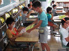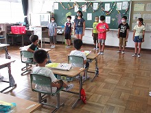 1年生の教室に、2年生から6年生まで順番に八輪っ子たちがやってきました。プレゼントや学校のクイズなど、子どもたちのアイデアいっぱいの歓迎の出し物に、1年生は大喜びでした。