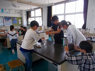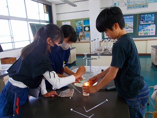 集気びんにろうそくを入れて燃やすとろうそくは消えてしまいます。空気には酸素・窒素・二酸化炭素が含まれていますが、ものを燃やす働きのある気体はどれだろうか、予想を立てて確かめる実験をしました。集気びんに水をいっぱいに入れて気体を送り込み、ふたをして集気びんに気体を集めます。閉じ込めた気体の中にろうそくを入れてふたをしてろうそくの火がどうなるか、真剣な表情でを観察していました。集めた気体によって、一瞬で燃え上がったり消えたりするので、実験の様子はタブレットで録画しました。気体を送り込む人、すばやくふたの開け閉めをする人、ろうそくを入れる人、タブレットを操作する人と役割分担して実験は大成功でした。