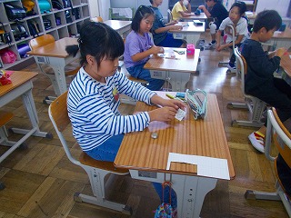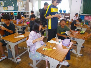 3年生の算数では、「円と球」の学習で使うこまを作っていました。工作用紙の中心に穴をあけてつまようじをさしてできあがりです。正方形のこまと好きな形のこまの2種類を作りました。回すのが楽しかったようですが、ここからが学習です。工作用紙に赤鉛筆で印をつけて回すとどんな形に見えるかを予想して確かめました。