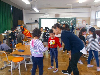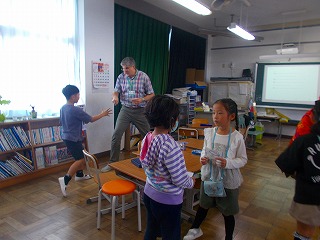 2年生の教室からハロウィンソングと楽しそうな笑い声が聞こえてきました。ハロウィンソングを英語で歌いながら、ゴーストの数を数えていたようです。その後、年齢の数字が書いてあるカードをもってジャンケンをして「How old are you ?」「I
