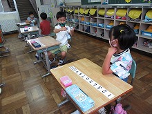数字カードをつかって、「10といくつ」という問題を、隣同士で出し合いました。問題を出す方も、答える方も楽しそうでした。