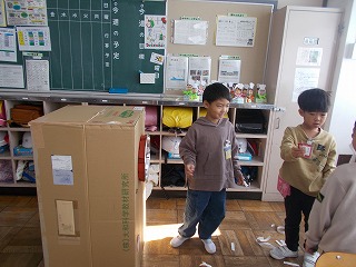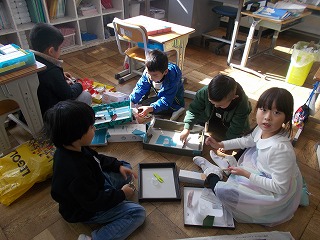 生活科で集めたどんぐりやおなもみ、落ち葉を利用しておもちゃ作りをしました。空き箱を利用して迷路を作ってどんぐりを転がしたり、おなもみを投げてダーツにしたり、ドングリをつめこんでマラカスにしたりと夢中で作っていました。作りながら試してみて、楽しんでいました。
