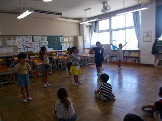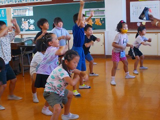 厳しい暑さが続いているので、教室や音楽室で応援の練習やラジオ体操の練習をしています。2年生は、「ソーラン節」の動画を見ながら、勇ましくかけ声をかけて力強く踊っていました。1年生は、「ゴーゴーゴー」を元気よく歌った後に、ラジオ体操と「ソーラン節」の練習をしました。動画を見てポイントを押さえて練習した後に、ミニ発表会もしました。友達に良かったところを褒めてもらい嬉しそうでした。