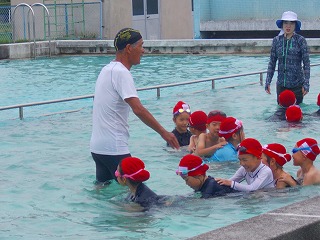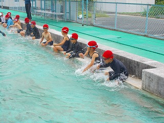1年生は、今日がはじめての水泳の授業です。水着に着替えてドキドキワクワクの1年生は、落ち着くためにみんなで深呼吸してから教室を出発しました。体操の後、バディーを確認して座って水をかけるところから始まりました。プールの中をアヒルさんやワニさんになって歩いたり、じゃんけん列車のようにつながって歩いて、水に慣れていきました。