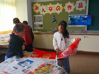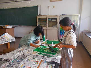 段ボールや丸いプチプチのあるビニールなど凹凸のある素材をいかして昆虫を描き、紙版画を作っていました。版ができあがった人からローラーでインクを隅々までつけて、バレンでこすります。細かな模様が写るように丸く円を描きながらこすります。最後は、そーっとめくって仕上がりを確かめていました。