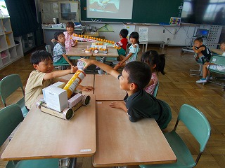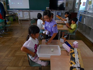 1年生は昨日、いろいろな空き容器等を使ってグループごとに乗り物や動物をつくりました。今日は、使った空き容器等を仲間分けする学習をしました。似ている形を見つけて仲間分けしたところ3つの形に分けることができました。最後に、筒の形・箱の形・ボールの形の特徴を確かめるために「手探りゲーム」をして楽しみました。