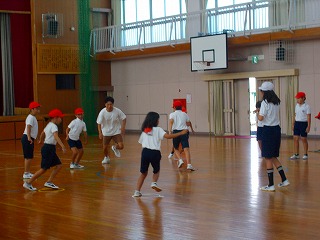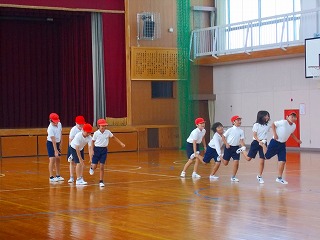 体育館から楽しそうな声が聞こえてきました。けんけんのポーズで前の人の片足をもってつながりけんけんして進みます。途中ではなれてしまったら、そこから「せーの」と声を掛け合って進んでいました。二人組で手押し車をした後、フラフープを使った人間バスケット(フルーツバスケットの体育編)をしました。相手の動きを見てすばやく動いたりチームで協力して動いたりすることができていました。