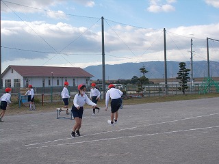 5年生の体育では、走り幅跳びの練習をしていました。記録を伸ばすには、強く踏み切ること、腕のふりを利用すること、両足で着地することがコツになります。そのコツをつかむために、4つのコースでグループごとに練習しました。ミニハードルやバーを使ってリズミカルに走り、高く遠くに跳び、両足で着地する感覚を体得できるように練習しました。