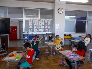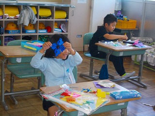 1年生の図画工作では、三角や四角に折った折り紙をはさみでチョキチョキ切って飾りを作りました。はじめに、切る時のはさみの向きなど安全なはさみの使い方を学習しました。次に、折り紙を折って思い思いにはさみで模様を作りました。そっと開いて「お花みたいになった」と見せてくれたり、「お面みたい」と顔にあてたりして出来上がった模様を楽しんでいました。