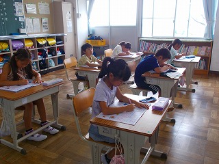 1年生は、ひらがなの学習に続き、カタカナの学習をしています。今日は「ロ(ろ)」を覚えました。形が似ていても真四角ではないことや、縦線がやや斜めになっていることに着目しました。書き順は、大きく書いたり小さく書いたり首を動かして書いたりと、いろいろな方法で繰り返し覚えました。その後、「足はぺったん・・・」で始まる良い姿勢と正しい鉛筆の持ち方を唱えて練習しました。