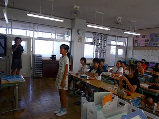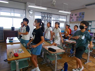 5年生の教室でオンラインの「ハッピートーク朝の会」を行いました。まずは、手を肩から上に上げると脳から元気ホルモンが出るということで「かきくけこ」を手振りをつけて発音する練習をしました。次に、早口言葉にチャレンジしました。最後は、気持ちが落ち込んでいるときは、少し上向きで大きく歩いたりスキップしたりすると効果があることを教えていただきました。