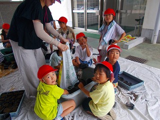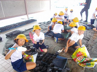 5月10日にまいた種が順調に発芽し、明日14日にポットへの植え替えをすることになりました。今日は、その準備のため1・2年生がポットの土入れをしてくれました。ポットに土を入れてかごに並べ、かごがいっぱいになったら運びます。「協力するぞー!」と声をかけたり、友達同士で役割分担して作業したりして、次々にポットを入れたかごが並びました。最後は、こぼれた土を一生懸命手で集めてポットに入れる様子も見られ、感心しました。なんと出来上がったポットは約1000ポット。1・2年生の皆さんありがとう。お疲れ様でした。