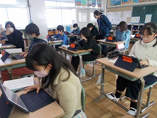 6年生のICT授業では、卒業アルバムにのせる「思い出新聞」の原稿をつくっていました。6年間の思い出ベスト3などの記事を入力していました。何といっても修学旅行を選んだ児童が多く「こんなことがあったね」と振り返りながら、それぞれのペースで進めていました。