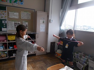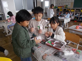 1年生は、カラフルな紙粘土を使って「ごちそう」を作っていました。お寿司やステーキ、パフェ、アイス、お弁当などなど、実に楽しそうに作っていました。色をまぜてマーブル模様にしたり長く伸ばして粘土の感触を楽しんだりしながら、自分だけのごちそうを作っていました。友達と作ったものを見せ合いながら、自分の作品作りにいかしていました。