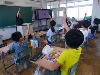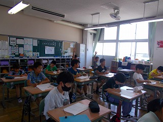 5年生の総合で「HAPPY TALK」の出前授業を行いました。はじめに、後出しジャンケンを2回やって勝つように出すよりも負けるように出す方が難しいことを実感しました。普段ジャンケンは勝つことを意識しているからだそうです。言葉も、よく使う言葉は言葉の引き出しの上の方にあり、使った言葉にピッタリのホルモンが流れることも知りました。そこで、自分が言われて嬉しい言葉、元気が出る言葉などをクラスみんなで30個、書いて、話して、言葉の引き出しをプラスの言葉でいっぱいにしました。