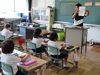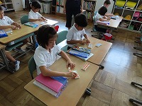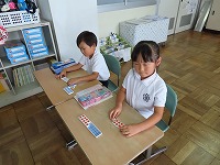 1年生は、算数の時間「20までのかず」の学習で、先生が示した数を見て数図ブロックを操作しました。10のかたまりを意識し、10のかたまりといくつを分けてブロックを並べることができていました。エアコンのきいた教室で、快適に学習が進んでいます。