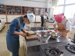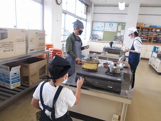 ぁ!おいしい」をめあてにスタートしました。真剣な表情で鍋の中のご飯を見つめて音を聞く子、「包丁で切るときはねこの手で」とつぶやきながらねぎを切る子、教科書を確かめながら弱火にするタイミングを見る子など、作業を分担し協力し合いながら調理を進めることができました。