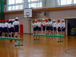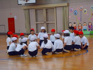 体育館から「やったー」と喜びの声が聞こえてきました。みんなで輪になり、つないだ手でギュッとして合図を伝え、一周が何秒でできるかを測っていました。回数を繰り返すことでタイムが縮まり、喜び合う姿が印象的でした。次は、横歩き・後ろ歩き・ツーステップ等、いろいろな方法で平均台を渡ります。後ろ歩きが不安な様子が見られると、横で手をつないであげる優しい姿も見られました。最後に、男女対抗で「ボール渡し」「ボール送り」「ドーンジャンケン」などをする中で、自然にチームで協力して作戦を立てたり声をかけたりすることができました。