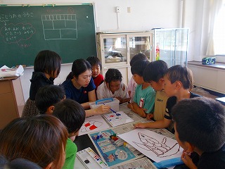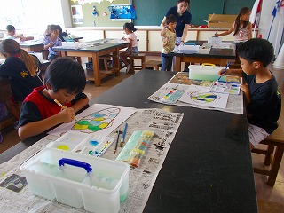 画用紙いっぱいに描かれた魚のうろこを虹色にするのが今日のめあてです。絵の具はパレットの小さい部屋に出して、すくって大きい部屋でのばすこと、1・2・3の部屋で順番に筆を洗ってから次の色をつかうこと、4の部屋はまほうのお水だから透明のままで水が足りない時につかうことなどをみんなで確認して、自分の魚のうろこを虹色にぬっていました。画用紙に描かれた魚がカラフルでおしゃれな魚に変身していきました。
