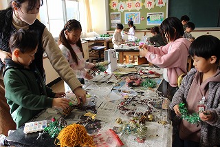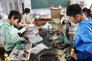 家からもってきたリボンやビーズは自分でボンドで思い思いの場所につけました。すてきなリースに仕上げようと真剣な表情で作っていました。終わった人から、2年生は2個目のリースを作り、1年生は緑のまつぼっくりでクリスマスツリーを作りました。