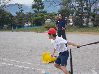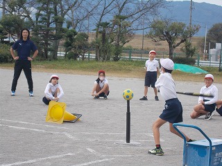 「いくぞ!」「オー」のかけ声をかけながら、ティーボールの試合が始まりました。試合はやはり盛り上がります。同じチーム同士で、守備位置やうつ場所などをアドバイスしていました。守備側は、とったボールをどこに投げるか、攻撃側はどこまで走るのか、その時々の判断が必要になるので、チームで声をかけ合いながら協力しているところがいいなと思いました。