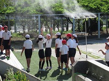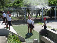 運動会の練習等、外での活動のときには、子どもたちは昇降口付近に設置された「ミストシャワー」のところで涼ををとっています。また、こまめな水分補給等の熱中症対策を、子どもたち自身で考えられるようにもなってきています。