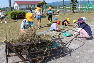 初夏の強くなり始めた日差しの下、1年生から6年生まで、助け合い、声を掛け合いながら、一生懸命に作業をしていました。
