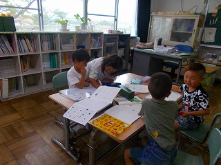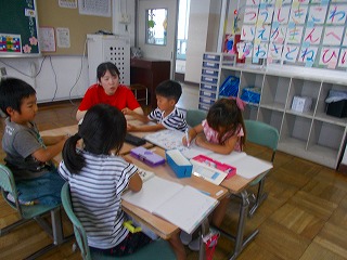 1年生の国語では、小さい「つ」、つまる音の学習をしました。はじめに「ねこ」と「ねっこ」を手拍子で打つと1拍分お休みがあることがわかりました。書く時には、2の部屋に小さく「つ」と書くことを練習しました。最後に、グループみんなでホワイトボードに、「ぺっとしょっぷ」「たぶれっと」など、小さい「つ」のつく言葉をたくさん考えて書きました。