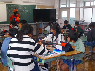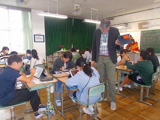 6年生の外国語では、3つの世界遺産についての紹介動画を見て聞いて、聞き取った事柄をグループで話し合いタブレットのワークシートに書き込んでいきました。修学旅行で訪れた京都・奈良など日本の世界遺産についても調べました。最後に、ハロウィンが近いということで、世界の習慣を知り日本との違いを考えました。