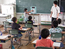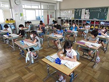時計の長針が1目盛り動くと1分であることや、1周回ると60分であることを、模型の時計を使って確認しました。また、時計を5分区切りや10分区切りで読み取ると便利であることを発表し合いました。