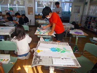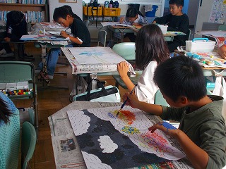 4年生の図画工作では、「まぼろしの花」を描いていました。水彩の良さをいかすために「水たっぷり」で彩色することや、指やスポンジでクレパスや絵の具をこする技法を教えてもらい、思い思いのイメージの「まぼろしの花」を表現していました。それぞれの思いがこめられているのでしょう。真剣な表情で彩色する姿がすてきでした。