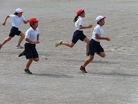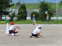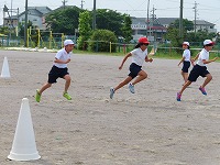 5年生は、「短距離走」をしました。学校が再開して間もないため、急に50mを全速力で走るのではなく、距離を短くし、さまざまな体勢でスタートしたり、体勢を低くしてゴールを目指したりして体を慣らしました。