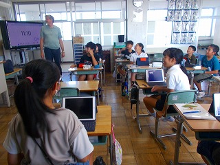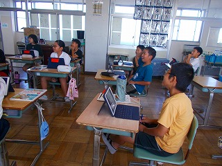 5年生の外国語では、人物を紹介する英文を読んで、誰のことを紹介しているのかをあてるクイズをしていました。「彼は、アニメキャラクターで、どら焼きが好きで、ポケットからたくさんのものを出すことができる、さて誰でしょう」というヒントの英文を読んで相談し、「せーの」で「ドラえもん」と答えていました。クイズを繰り返しながら、人物の紹介の仕方や「~できる」「~できない」の言い方を学習することができました。