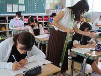 6年生は算数で「分数÷分数」の学習をしています。今日は、「分数÷分数」の計算の仕方を勉強しました。分数の性質を使い、わる数を整数にして計算する方法と、計算の仕方を示す面積図を使って計算する方法を考えました。「分数÷分数」の計算が正しくできるようになることはもちろん大切ですが、分数でわる計算は意味を理解して答えが出せるようになることも重要です。頭を使って学習する姿が見られました。