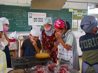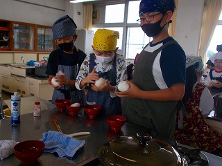5年生の家庭科で初めての調理実習を行いました。今日は野外活動の練習もかねて、鍋でご飯をたきました。お米にはかった分量のお水を入れて炊き始めると、火加減や時間を見る人とおにぎりを作る時の食器を洗って準備する人と分担をして、手際よく進めていました。火を消し蒸らしてふたを開けた時には、手でたぐりよせて炊き立てご飯のにおいを楽しんでいました。その後、ご飯をかきまぜラップでくるんで塩おにぎりを作ったのですが、しゃもじを立ててご飯をかきまぜたりおにぎりをにぎったりする手つきの良い子がたくさんいて驚きました。つやつやでほかほかのご飯で作ったおにぎりをみんなでおいしくいただきました。