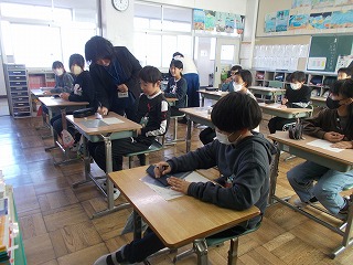 八開中の先生をお招きして6年生を対象に出前授業をしていただきました。前半は数学で、小学校の算数とどんなところが違うのかを教えていただきました。誕生月や日にちの数字を使った計算で、先生が誕生日をあてることができた理由について考えました。後半は、ミニ道徳でした。歌の歌詞を題材に「50年を50億で買いたいと言われたらどうするか」、自分の考えとその理由について話し合いました。最後に、部活動やテスト、宿題などについて質問し、中学校生活に期待をもつことができる時間となりました。