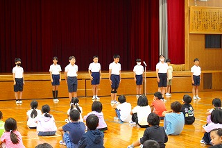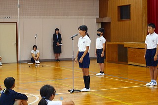その後、前期と後期の児童会役員の交代式を行いました。前期児童会役員は一人ずつ堂々と挨拶をして、それを受けて後期会長が代表で挨拶をしました。