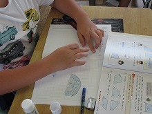 四角形を4つに切り離して角を合わせたり、分度器を使って測ったり、対角線を引いて2つの三角形に分けたりして考えました。どの考え方からも、4つの角の大きさの和は360°という答えが出てきました。