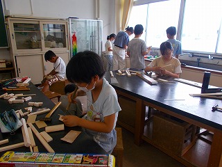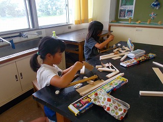 4年生の図画工作では、のこぎりで木材を切ったり、木と木を釘で打って固定したりして作りたいもの、動物や剣などを作っていました。ギコギコギコギコ、少しずつ少しずつのこぎりで切ったり、キリで少し穴をあけ釘を固定しトントン細かく打ったり、やっているうちにコツをつかんでいきました。