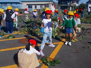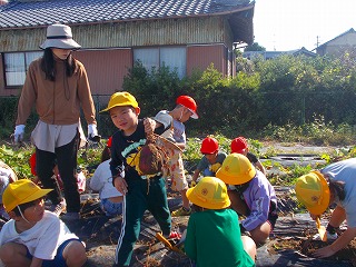 明日が雨予報ということで、今日芋掘りを行いました。掘りやすいように先生が長いつるを切り、子ども達は葉っぱをちぎります。つるは、リース作りに使うそうです。いよいよ芋掘りのスタートです。はじめはスコップで恐る恐る掘り進めていましたが、赤紫のお芋が見え始めると軍手で夢中で掘りました。大きいお芋はみんなで力を合わせて掘りました。