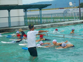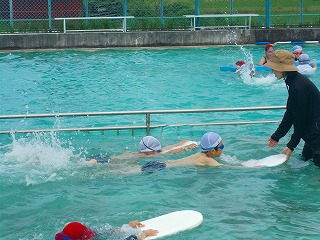 3年生の水泳指導では、クロールの泳ぎ方の練習をしました。ビート板を使ってバタ足をして進む練習、手のかき方の練習をしました。バタ足をする時はひざを曲げないことや視線はお腹をみること、そして、手を大きく動かし耳の横を通ることなどコツを水泳の先生から教えてもらいました。最後はビート板なしで、手すりまでいけるようにがんばって泳ぎました。