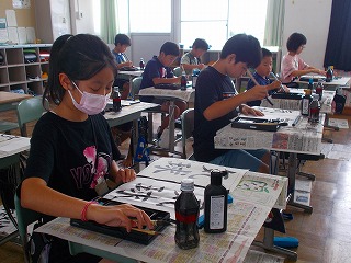 書写コンクールの練習がはじまりました。5年生は「気球」という文字を書きます。今日は練習なので、紙を折って中心線や字の大きさ、止めやはらいに気をつけて書きます。1枚試し書きをしたら、手本と見比べて、2枚目・3枚目と練習しました。書写コンクールに向けて真剣な表情で集中して練習することができました。
