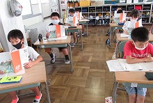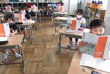 戦争の頃の話なので、当時の世の中のことを調べたり聞いたりしながら、学習を進めます。今日は、全員で一緒に音読した後、一人ずつ交代で音読しました。マスクをしていますが、元気いっぱいの声が教室中に広がっていました。