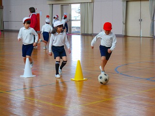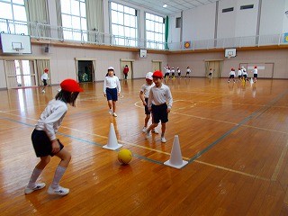 2年生の体育では、ボールけり遊びをしました。今日は基本技能の練習をしました。初めに対面でボールをける・止めるパス練習をしました。次にドリブル、ボールをけりながら進んでいき、ペアの子の周りをまわってもとの場所にもどる練習をしました。繰り返していくうちに少しずつけった方がまっすぐ進むことがわかってきました。最後はシュート練習です。決められた時間に、4か所のゴールに何回シュートできるかを、チームで競います。シュートする人を交代することやボールをまわすことなどもルールに加えて、みんなでシュートしていました。