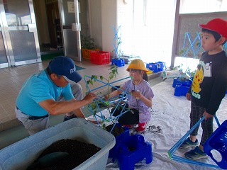 今年も「ミニトマトの先生」が八輪小学校に来てくださいました。毎年おいしいミニトマトができるように、苗の植え方・世話の仕方を教えてくださいます。はじめに植木鉢に土を入れて、そっと苗のポットを外して苗をおきます。茎が折れないように支えながら、周りに土をいれました。最後に支柱を立ててお水をたっぷりやりました。一人ずつ順番に苗を植えました。おいしいトマトになりますように、願いをこめて水やりします。